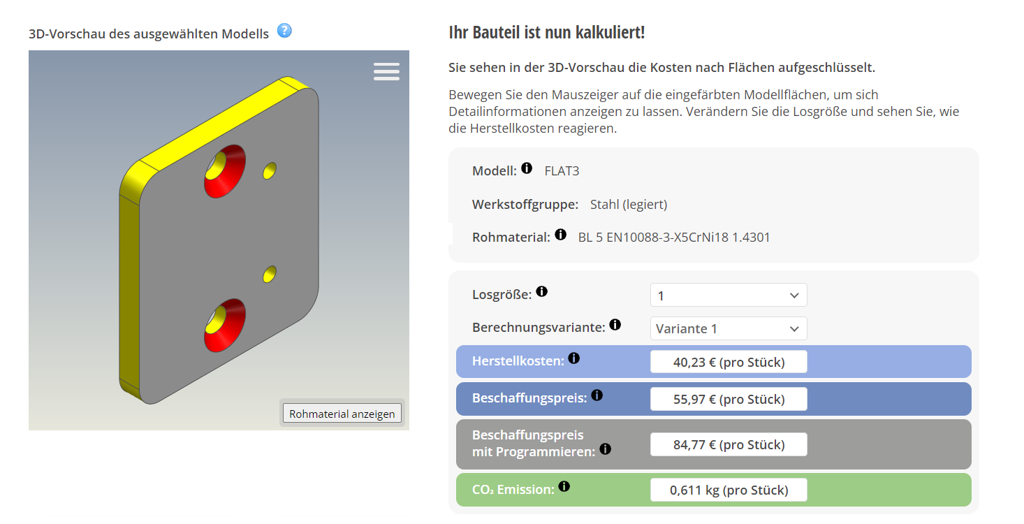 A preliminary calculation is performed based on the geometry of the part and the defined parameters. As a registered user, you can customize machine data, processing times, additional charges and more.